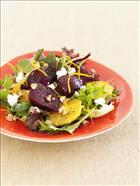 Dry roast the walnuts in a small frying pan until they toast slightly and become fragrant. Lay the beetroot quarters onto a small bed of mixed greens. Arrange the orange, zest and goats cheese between the beetroot. Drizzle each plate with walnut oil, and top with chopped walnuts.